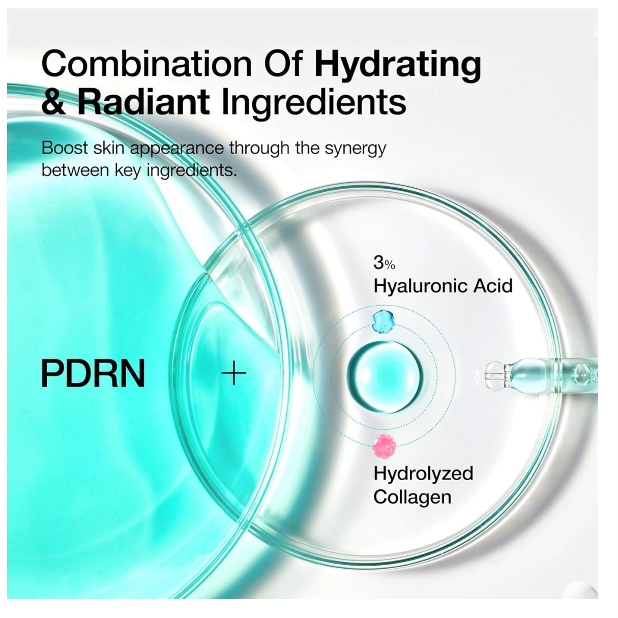 Agua, butilenglicol, propanodiol, glicerina, ácido hialurónico hidrolizado (29 049 ppm), 1,2-hexanodiol, niacinamida, oleato de glicerilo, lauril glucósido, miristilo glucósido, poligliceril-6 laurato, lecitina hidrogenada, glutatión, colágeno hidrolizado, hialuronato de sodio (800 ppm), extracto de raíz de Coptis Japonica, adenosina, ADN de sodio (100 ppm), ácido hialurónico (30 ppm), hialuronato de sodio hidrolizado (30 ppm), hialuronato de hidroxipropiltrimonio (30 ppm), hialuronato de potasio (30 ppm), polímero cruzado de hialuronato de sodio (30 ppm), hialuronato de sodio acetilado (1 ppm), extracto de hoja de Melia Azadirachta, extracto de flor de Melia Azadirachta, coccinia Extracto de fruta de índica, extracto de fruta de Solanum melongena (berenjena), extracto de hoja de Ocimum sanctum, ácido cítrico, extracto de raíz de Curcuma longa (cúrcuma), extracto de Corallina officinalis, citrato de sodio, pentilenglicol.