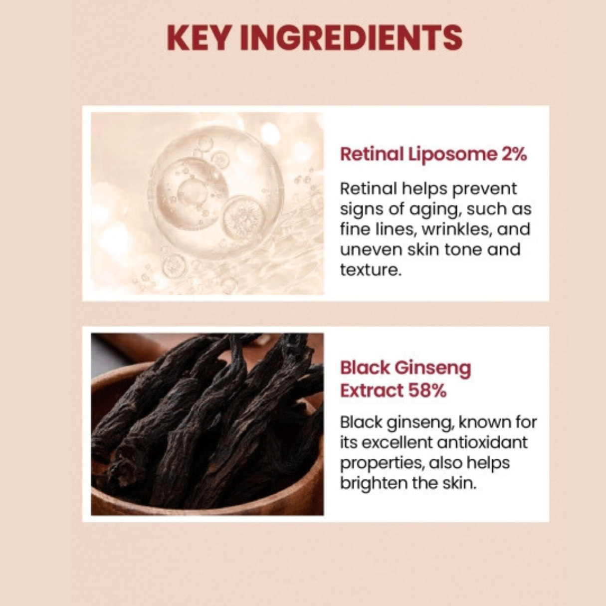 Componentes Clave: Retinal Liposome 2% (renovación celular), Black Ginseng Extract (revitaliza), Bakuchiol, Vitamina C y péptidos para estimular el colágeno.