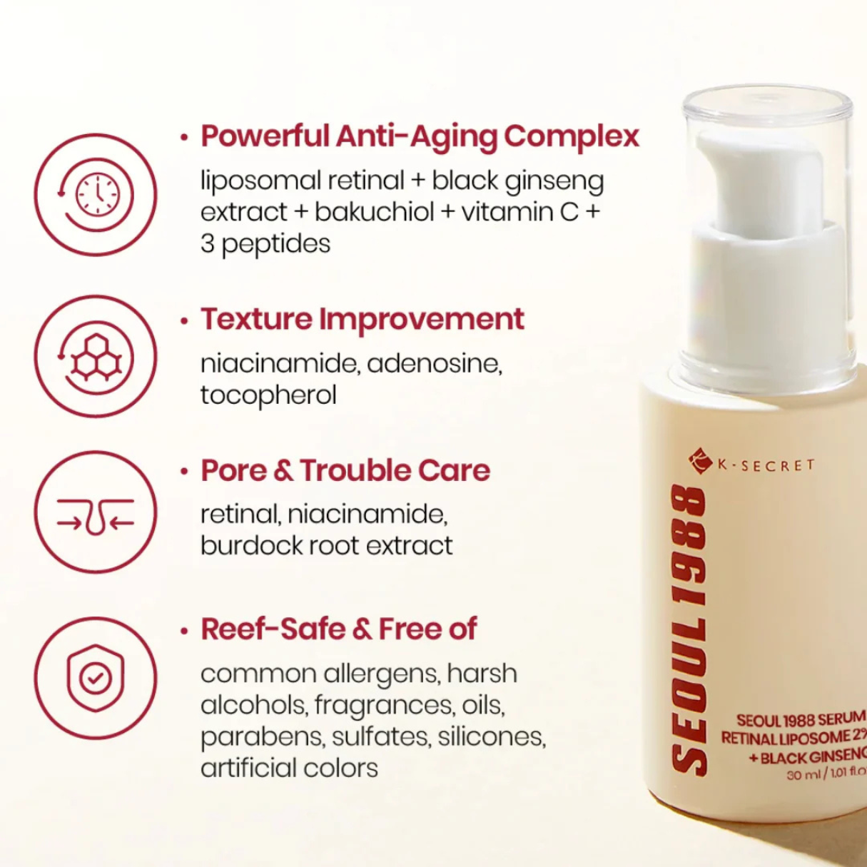 2 SERUMS DE 30ML: El K-SECRET SEOUL 1988 Retinal Serum Duo con Retinal liposomado encapsulado al 2% y Ginseng Negro, diseñado para mejorar visiblemente arrugas, firmeza y textura, luminosidad, mientras revitaliza la piel y apoya la regeneración celular.