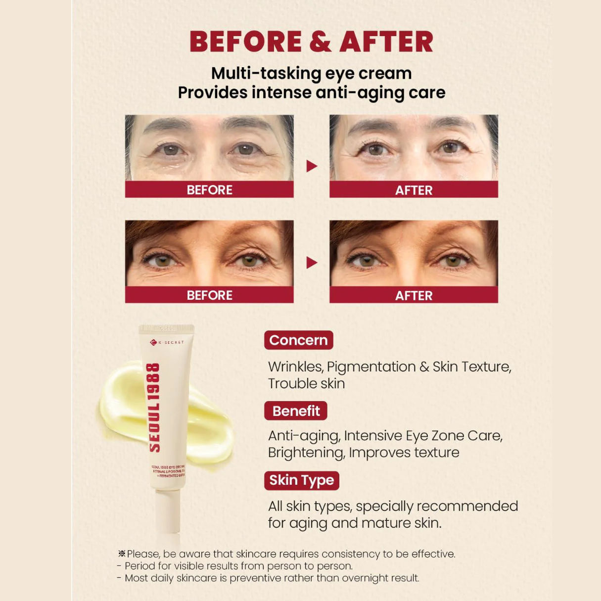 EYE CREAM: K-SECRET SEOUL 1988 Eye Cream: Retinal Liposome 4% + Fermented Bean 30ml Es un tratamiento antiedad avanzado diseñado para reducir arrugas, mejorar la elasticidad y aclarar el contornos de ojos. Contiene retinal encapsulado y extractos fermentados, y es apta para piel sensible. Gracias a su tecnología de encapsulación liposomal, el retinal se libera gradualmente, ofreciendo resultados visibles con menor irritación.