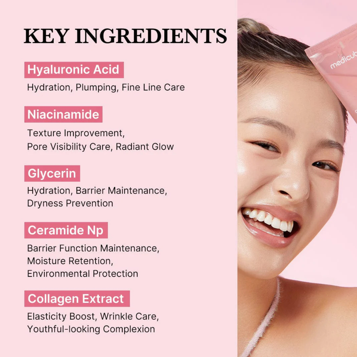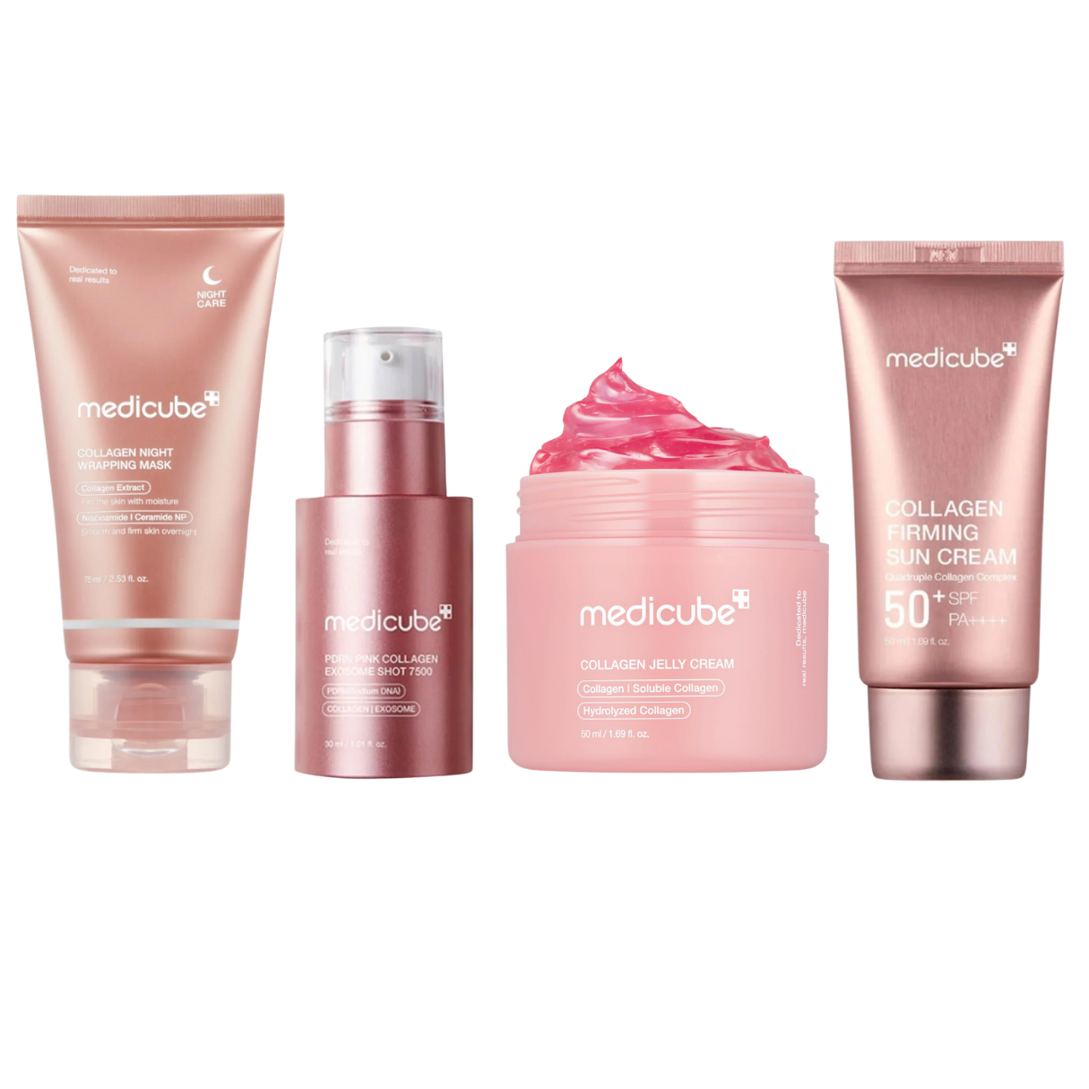 Un kit completo de cuidado facial de Medicube diseñado para hidratar profundamente, mejorar la elasticidad y reafirmar la piel. Combina poderosos activos como colágeno, exosomas y niacinamida para una rutina antiedad que fortalece la barrera cutánea y devuelve el efecto “piel firme y jugosa”.