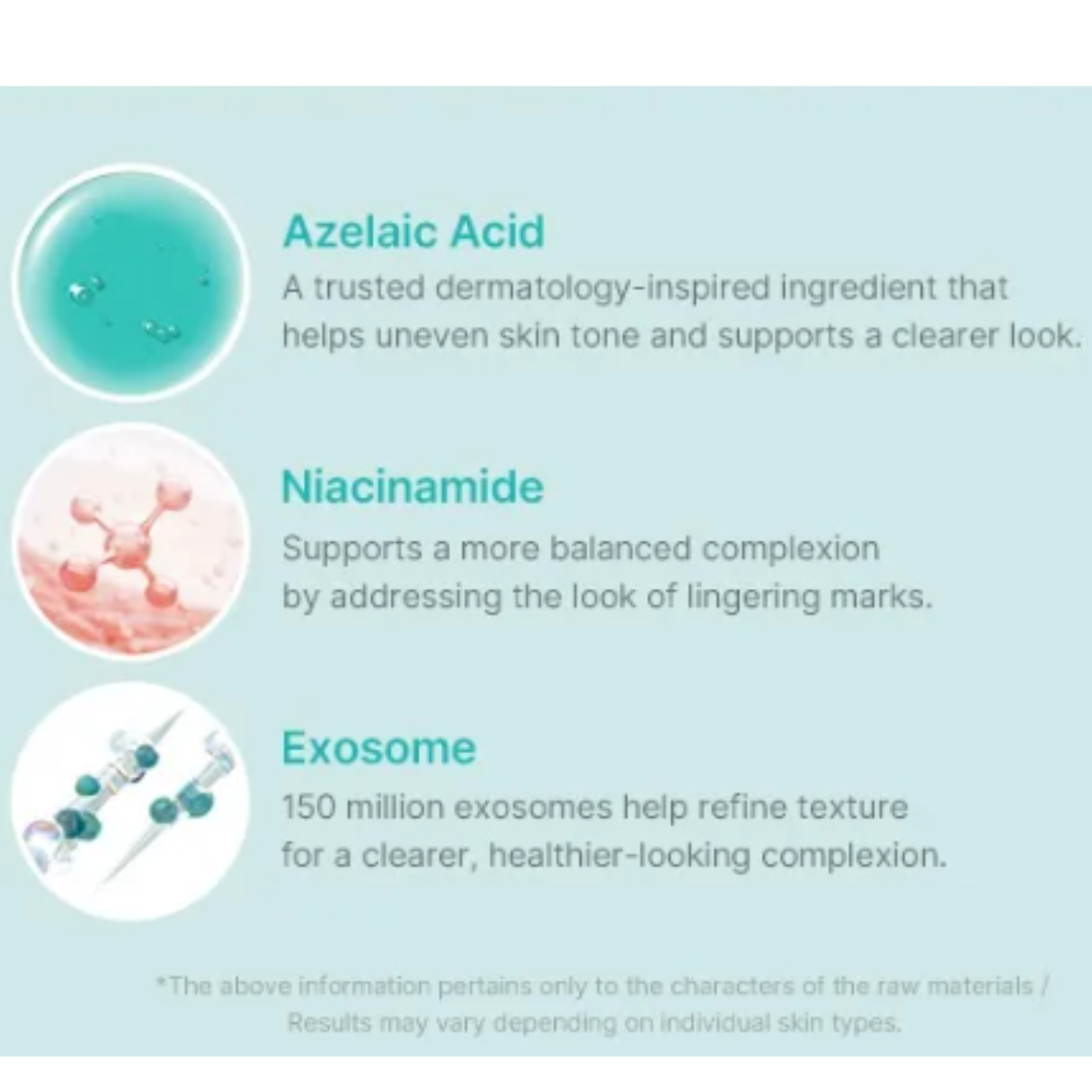 Agua, dipropilenglicol, niacinamida, glicerina, esponja hidrolizada, poliacrilato de sodio, hidroxiacetofenona, 1,2-hexanodiol, olivato de cetearilo, polideceno hidrogenado, extracto de hoja de Melia azadirachta, olivato de sorbitán, extracto de flor de Melia azadirachta, etilhexilglicerina, extracto de fruto de Coccinia indica, adenosina, borosilicato de calcio y aluminio, glucósido de caprililo/caprililo, EDTA disódico, extracto de flor de Aloe barbadensis, extracto de fruto de Solanum melongena (berenjena), ácido azelaico, extracto de hoja de Ocimum sanctum, extracto de fruto de Gardenia florida, vesículas extracelulares de Lactobacillus, extracto de Corallina officinalis, extracto de raíz de Curcuma longa (cúrcuma), dextrina, butilenglicol, salicilato de betaína, ácido cítrico, glicirrizato dipotásico, exosomas de leche. Pantenol, extracto de flor de Campsis Grandiflora, extracto de Centella Asiática, extracto de hoja de Centella Asiática, extracto de raíz de Centella Asiática, fermento de Saccharomyces, hialuronato de dimetilsilanol, ácido hialurónico hidrolizado, hialuronato de sodio hidrolizado, ácido hialurónico, hialuronato de potasio, hialuronato de sodio, hialuronato de hidroxipropiltrimonio, polímero cruzado de hialuronato de sodio, hialuronato de sodio, dimetilsilanol, hialuronato de sodio acetilado, asiaticósido, madecasósido, ácido asiático, ácido madecásico
