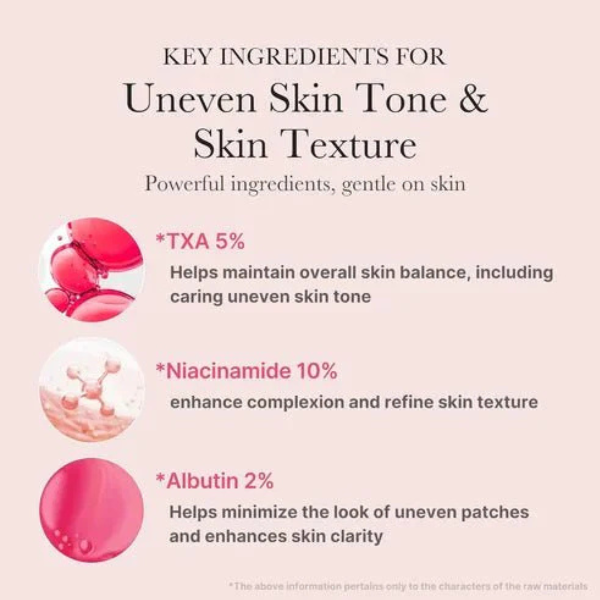 Agua, niacinamida (100 000 ppm), glicerina, butilenglicol, ácido tranexámico (50 000 ppm), arbutina, succinato de dietoxietilo, clorfenesina, C12-14 Alketh-12, etilhexilglicerina, goma xantana, carbómero, adenosina, EDTA disódico, extracto de hoja de Melia azadirachta, extracto de flor de Melia azadirachta, 1,2-hexanodiol, pantenol, cianocobalamina, betaína, extracto de fruto de Coccinia indica, aceite de flor de Rosa centifolia, ácido ferúlico, extracto de Corallina officinalis, pentilenglicol, glutatión, ácido hialurónico hidrolizado, hialuronato de sodio hidrolizado, hialuronato de dimetilsilanol, ácido hialurónico, hialuronato de potasio, hialuronato de sodio, hidroxipropiltrimonio Hialuronato, polímero cruzado de hialuronato de sodio, dimetilsilanol de hialuronato de sodio, hialuronato de sodio acetilado, acetil tetrapéptido-5, hexapéptido-9, palmitoil tripéptido-5