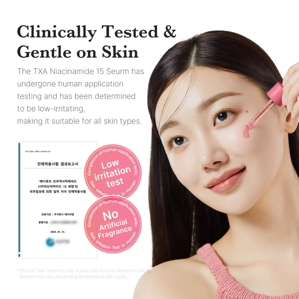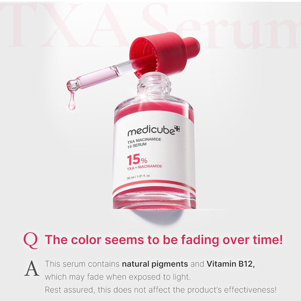 MEDICUBE TXA Niacinamide 15 es un sérum diseñado para tratar la HIPERPIGMENTACIÓN y las MANCHAS OSCURAS, además de mejorar el tono y la luminosidad de la piel.